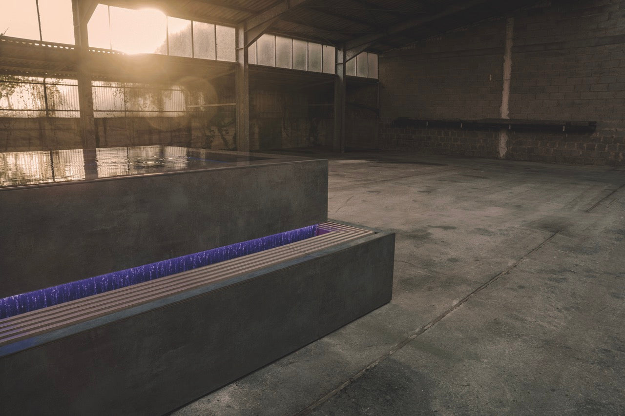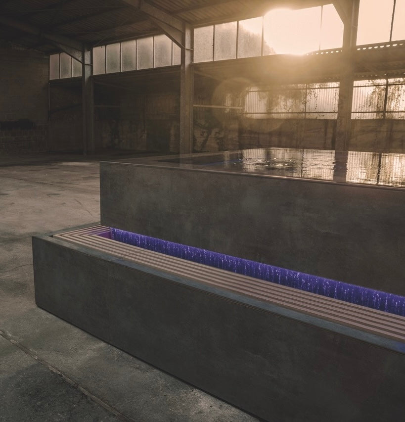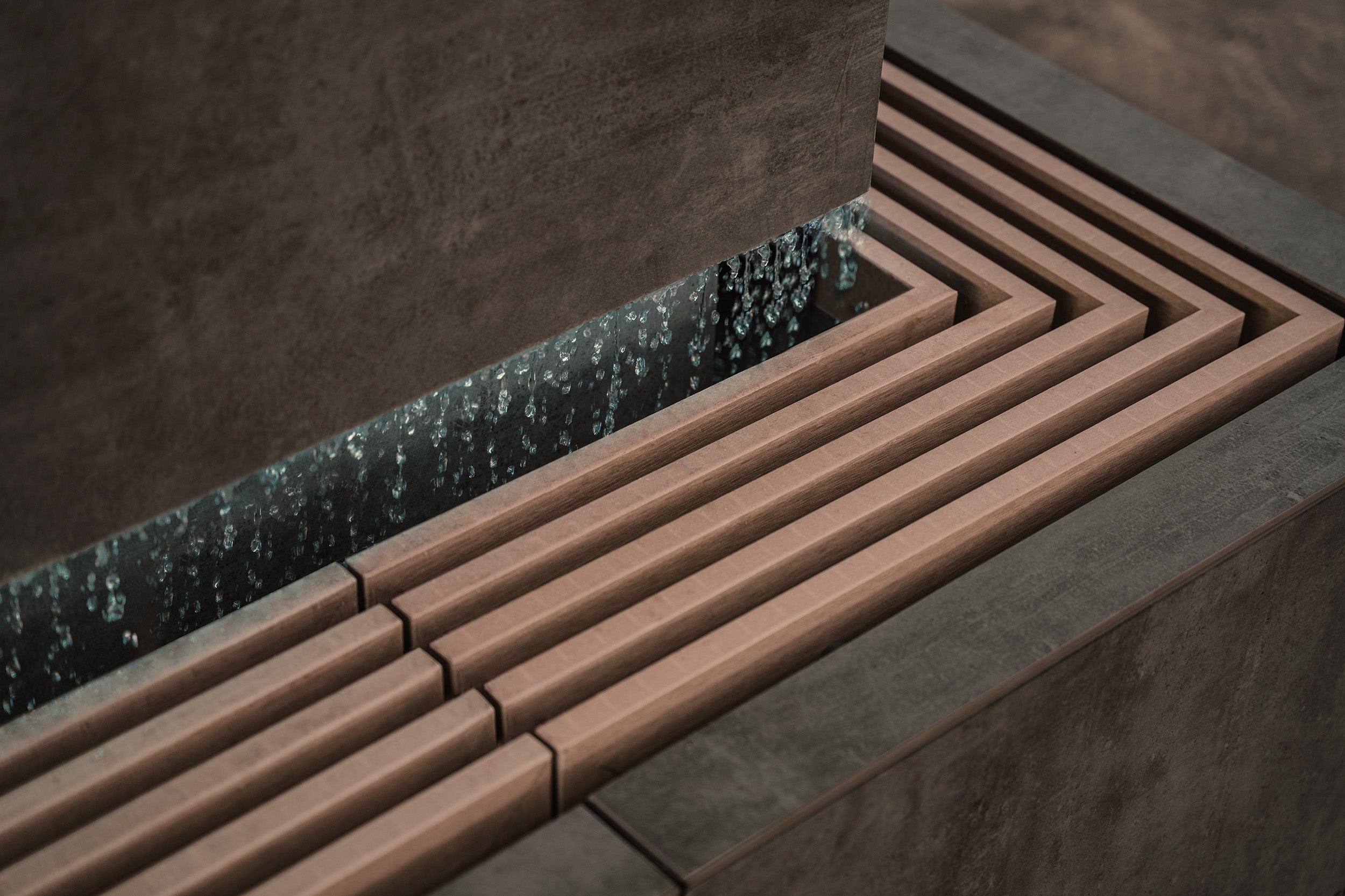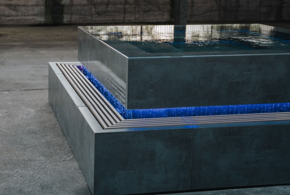 Circumferential waterfalls on the outer walls allow the water to circulate endlessly